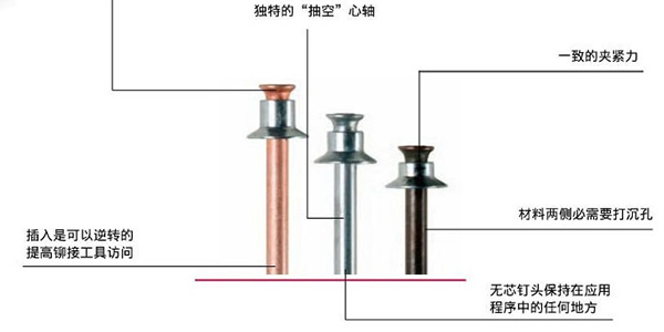 平頭拉釘緊固件與傳統螺栓利用扭力旋轉產生緊固力不同,平頭拉釘緊固件利用虎克定律原理,經由拉鉚釘專用鉚釘槍,在單向拉力的作用下,拉伸栓桿并推擠套環,將內部光滑的套環擠壓到螺桿凹槽使套環和螺栓形成100%的結合,產生永久性緊固力。